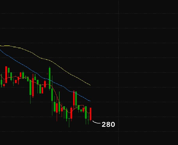 予想通り200近辺で耐えてたので、13時まで待って280で買いました。